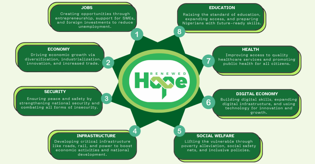 The “Renewed Hope Agenda” is a strategic framework by the Nigerian government, led by President Bola Ahmed Tinubu, to revitalize the nation’s economy and improve the lives of its citizens. It focuses on eight key priority areas: Jobs, Economy, Security, Infrastructure, Education, Health, Digital Economy, and Social Welfare. These areas are interconnected and aim to create a more prosperous, secure, and equitable Nigeria.