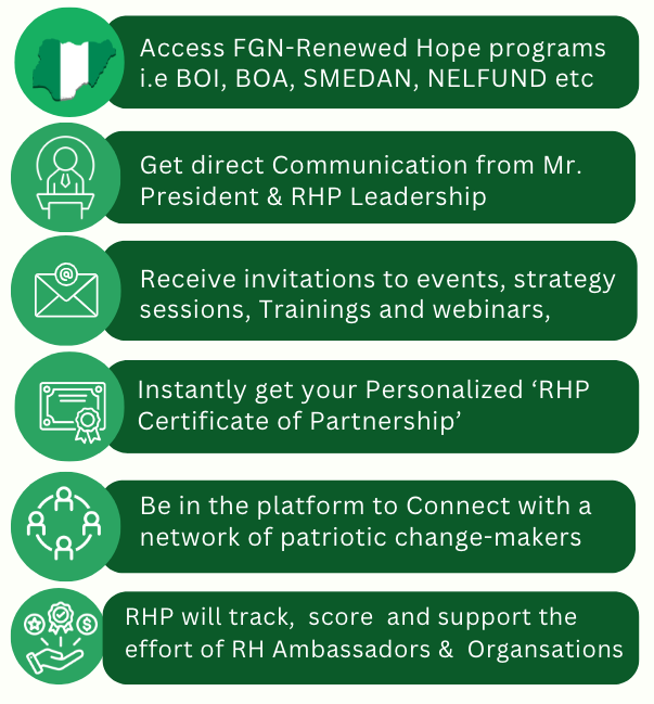 The Renewed Hope Partners (RHP) therefore is a nationwide citizens’ engagement platform created to support the bold and transformative roadmap focused on building a better, stronger, and more inclusive Nigeria.